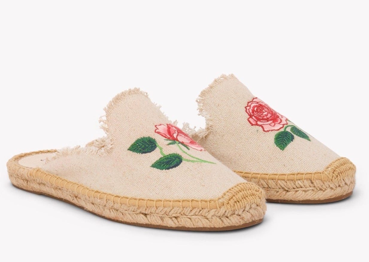 Rosy espadrilles: I luuuvv it when shoes are slightly different from each other, like these rose embroidered mules.