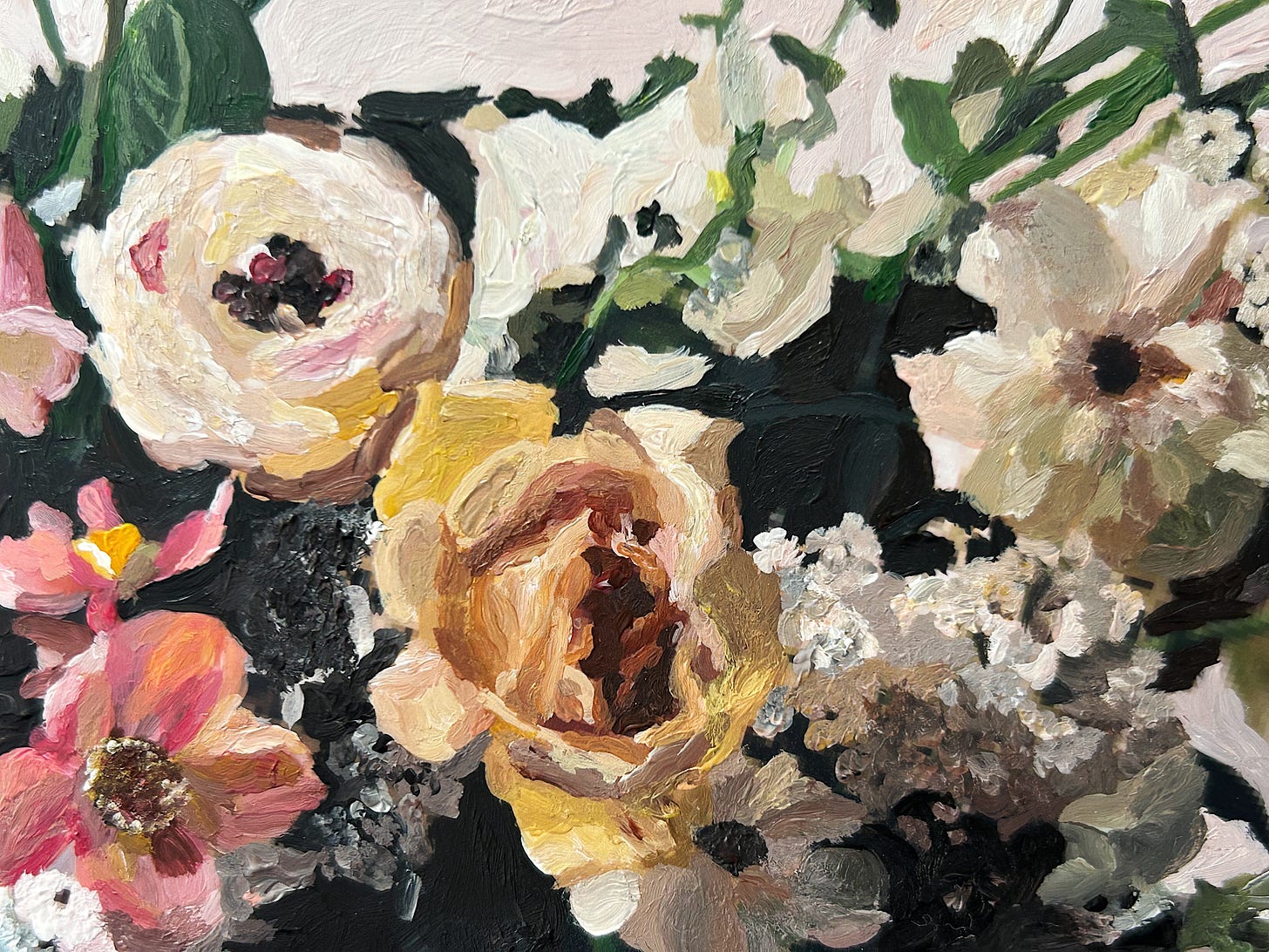 While I’ve been snuggling with my sweet boy (he’s ok! already back at school!) and catching up on 1.5 metric tons of laundry, my Tinge Floral painting has waited quietly on the shelf. She’s nearly done: